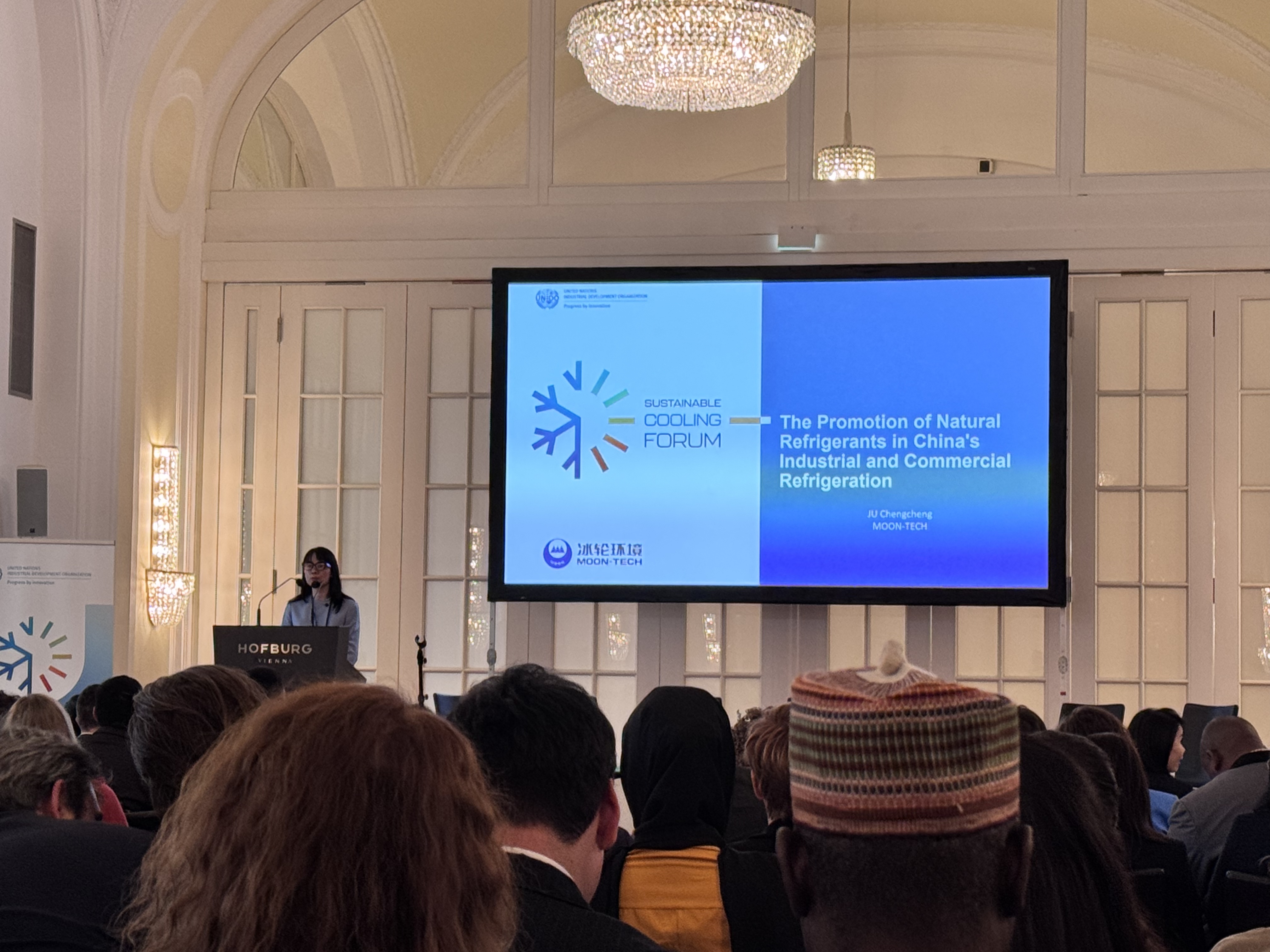 此次,冰轮环境受UNIDO邀请,随生态环境部和中国家电协会同行参加全球可持续制冷论坛。冰轮中央研究院副院长剧成成在9号霍夫堡宫的气候论坛上作技术报告,主题为《The Promotion of Natural Refrigerants in China's Industrial and Commercial Refrigeration》(自然制冷剂在中国工商制冷领域的推广应用)。报告中,冰轮环境分享了自身在绿色制冷剂领域的技术积累与实践成果,重点介绍了NH₃/CO₂复叠制冷系统、HCs制冷系统在工商制冷及热泵领域的市场应用拓展情况,展现了中国企业在可持续制冷技术领域的创新实力。